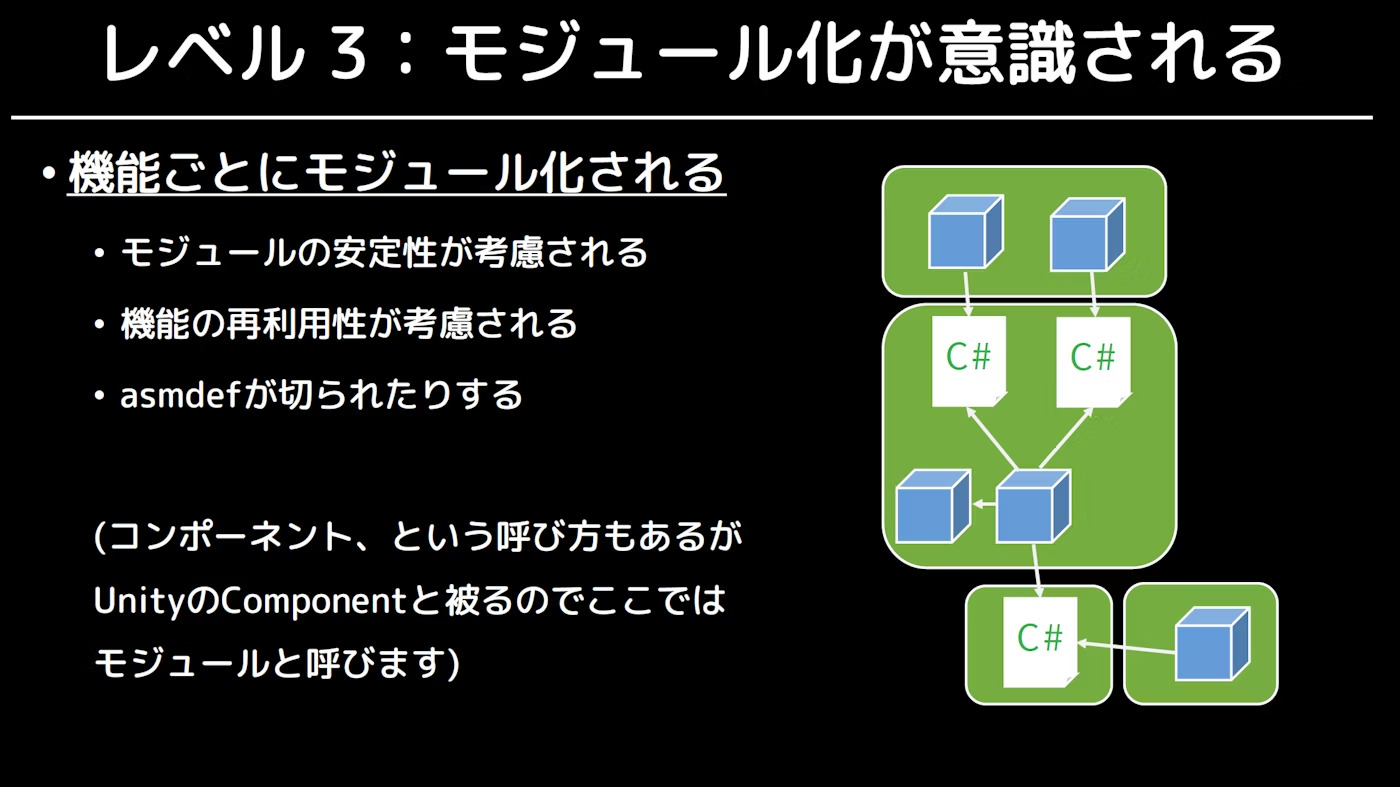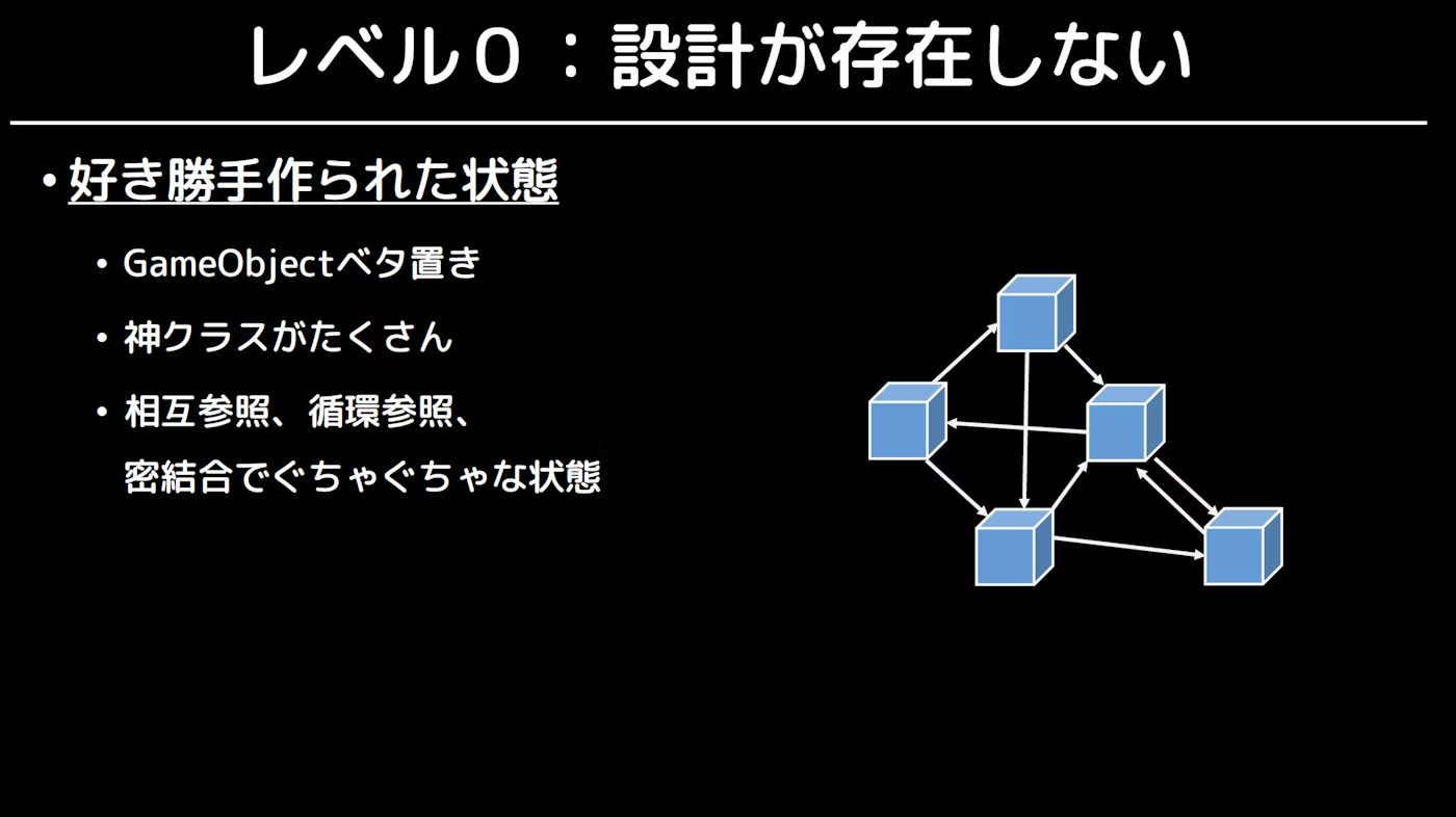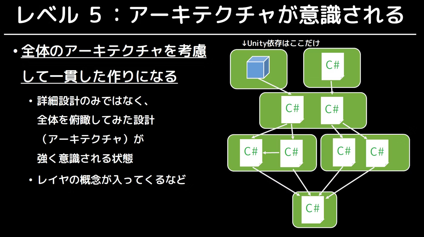 Unityにおける設計を考える上で参考になるものがあります。それが、とりすーぷ氏が定義したUnityにおける設計レベルです。公式的なものではないですが、設計を考える上で有用なので取り上げます。ちなみに、第2回までの内容はここでいうレベル2を目指した内容となっています。
