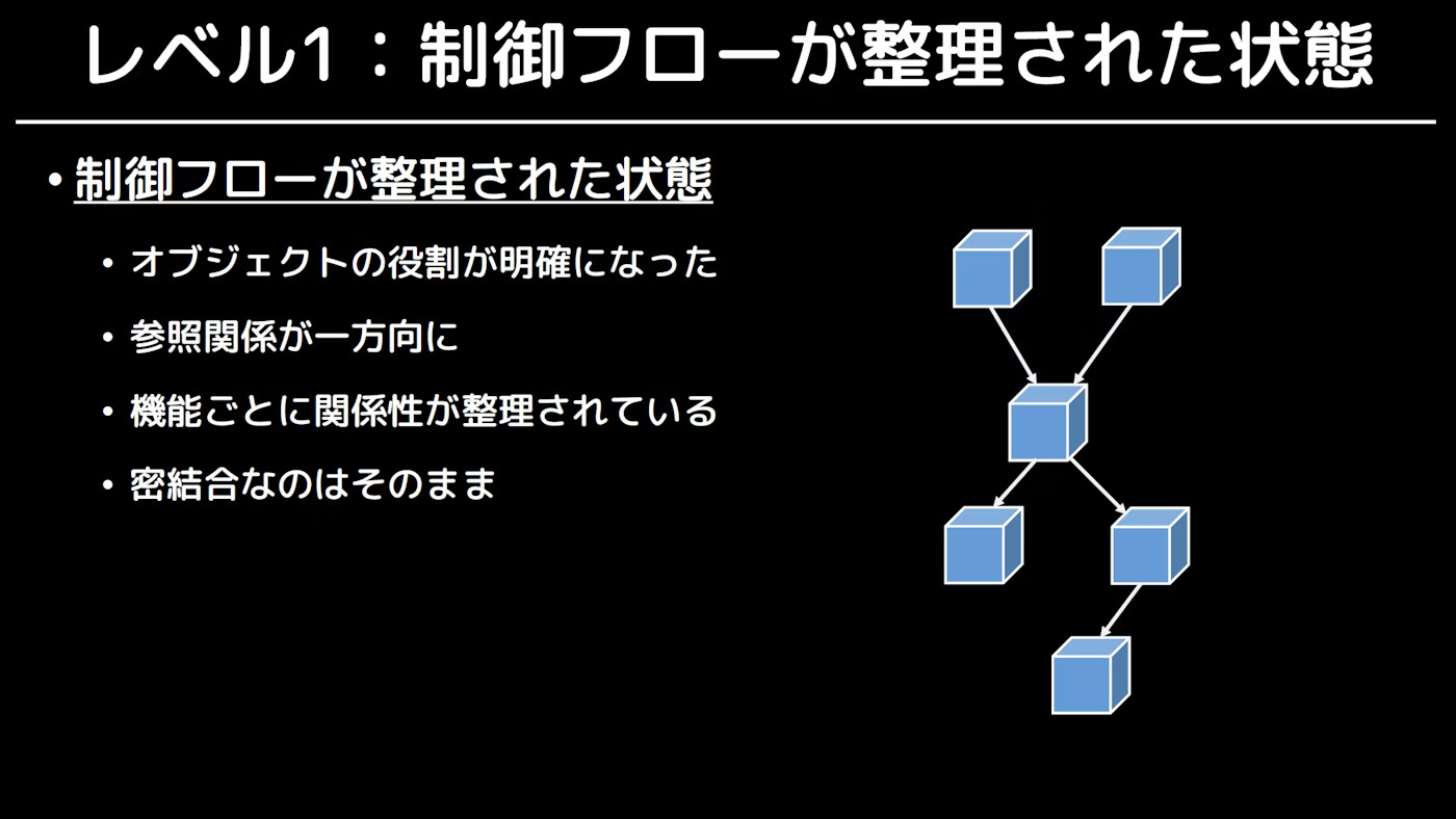 | 1 | 制御フローは整理されているが密結合な状態 |